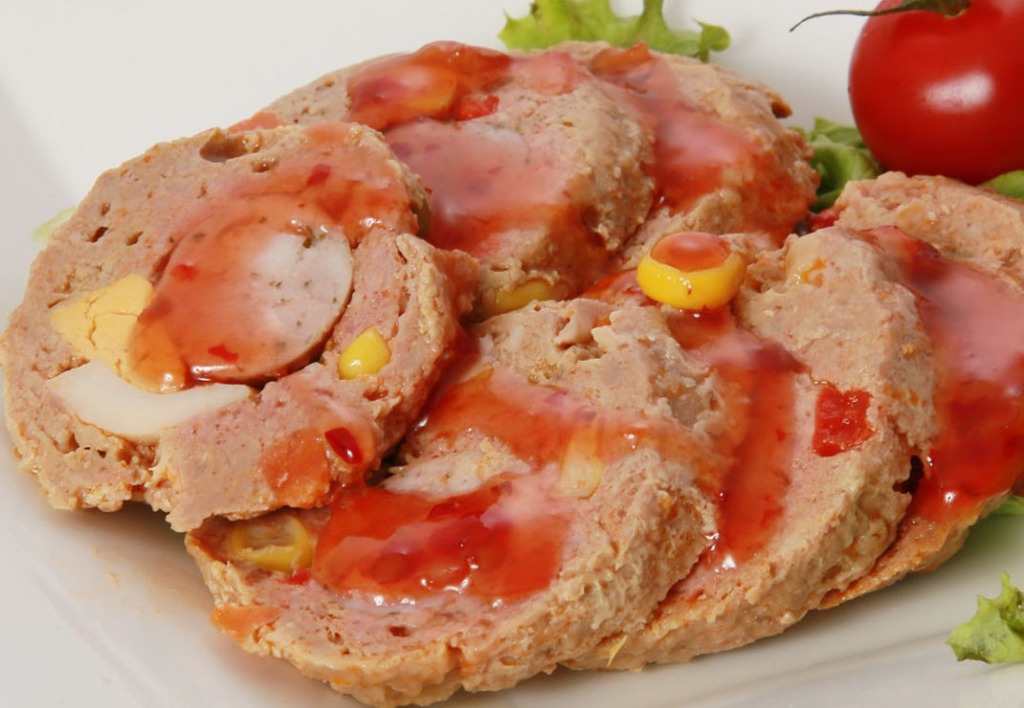 ひき肉でソーセージとゆで卵を巻いた物
